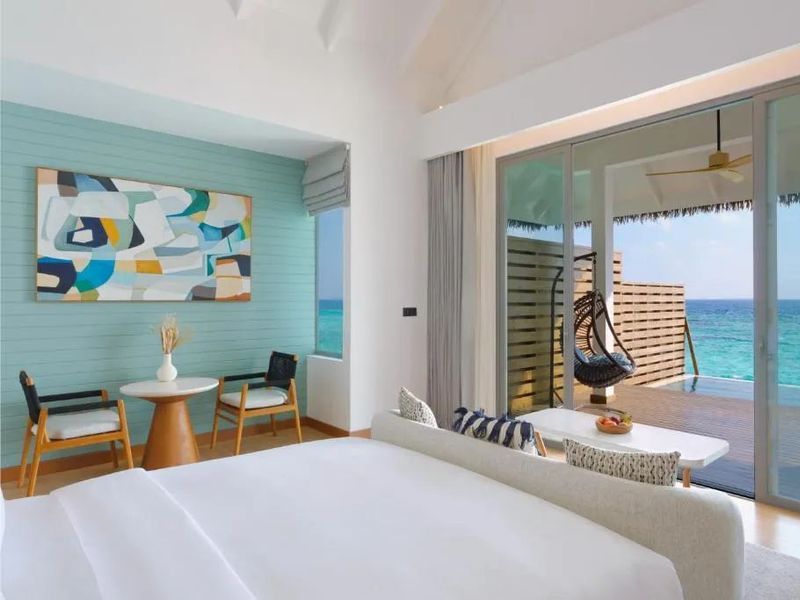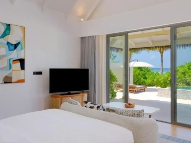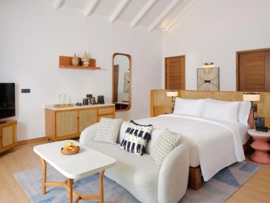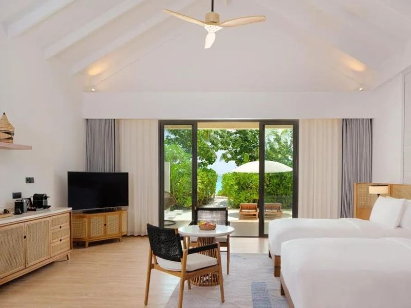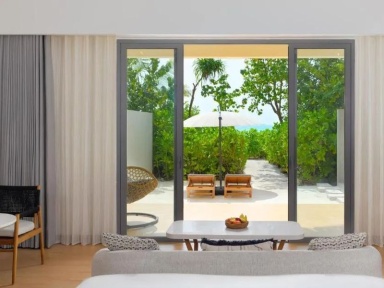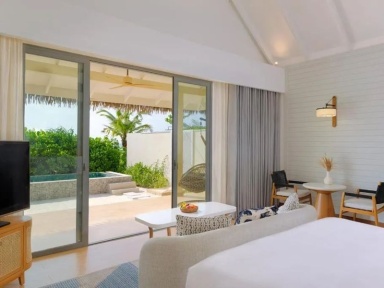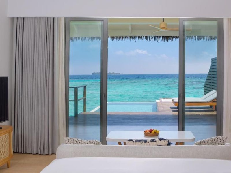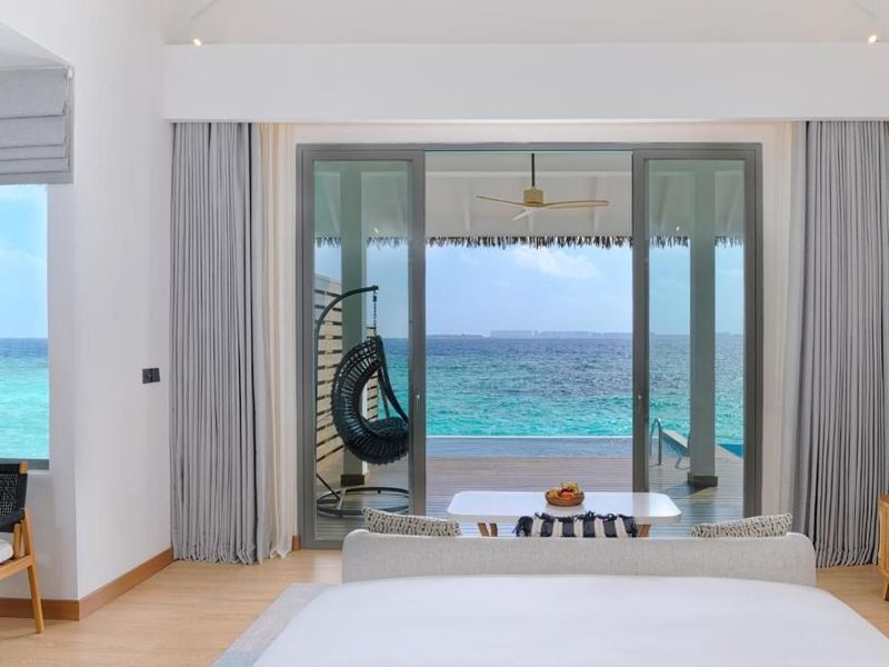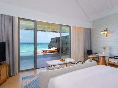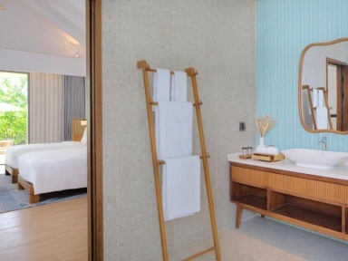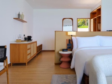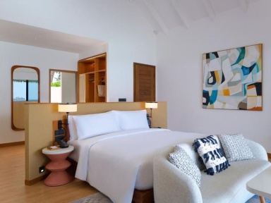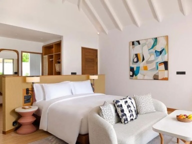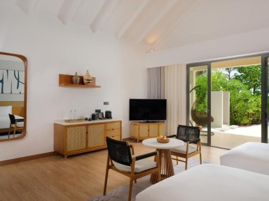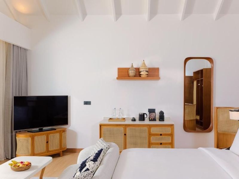 Пляжные и водные виллы просторные, с отдельной зоной отдыха и даже собственным бассейном в некоторых категориях. Для семей особенно удобны номера с отдельной детской комнатой. Уборка проводится два-три раза в день, мини-бар пополняется ежедневно. Гости отмечают высокое качество постельного белья и полотенец.
